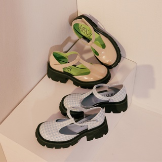 叛逆性格開邊珠T字帶厚底鞋-米綠