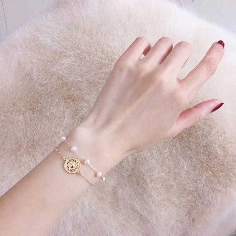 14k注金材質雙層羅盤手鍊滿天星設計 時尚百搭清新秀氣 4-5mm天然珍珠